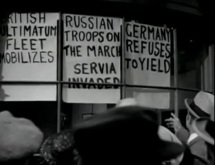 Dark, agitated, swirling, dissonant music in a low register, very slowly rising and building tension as the threats of war loom; a sign is put up that says "Germany Refuses to Yield" |