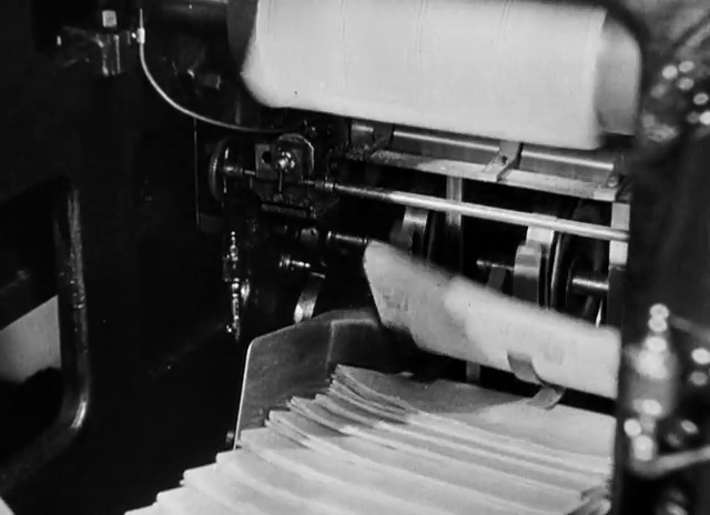 Mechanical music as we watch newspapers being pressed; the syncopated trumpet gesture from the opening titles (Cauldron 1) is then added as a layer above it; additional music is cut here |