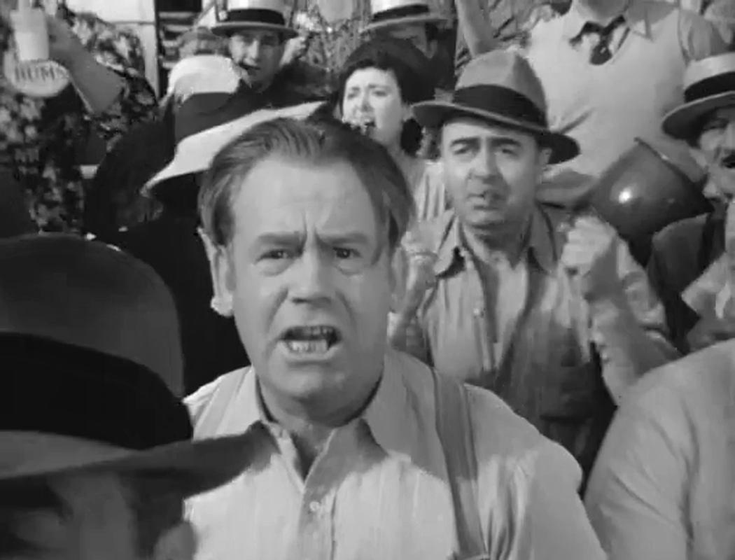 Description: Ballpark rendition of "Take Me Out to the Ball Game"; the band members are seen briefly (a trombone, bass drum, and saxophone player); there is a very loud trombone slide and bass drum hits that are not in the score (to rattle the pitcher) but were recorded in the studio (according to Steiner's notes); after the umpire is knocked to the ground, a chromatic glissando leads to a comic retuning of "Take Me Out to the Ball Game" in the key of Db (a half step up); Steiner left a lot of this arrangement to Hugo Friedhofer other than the beginning, transitions, and the modulation with the note: "Hugo: a very full arrangement (but simple!!)"