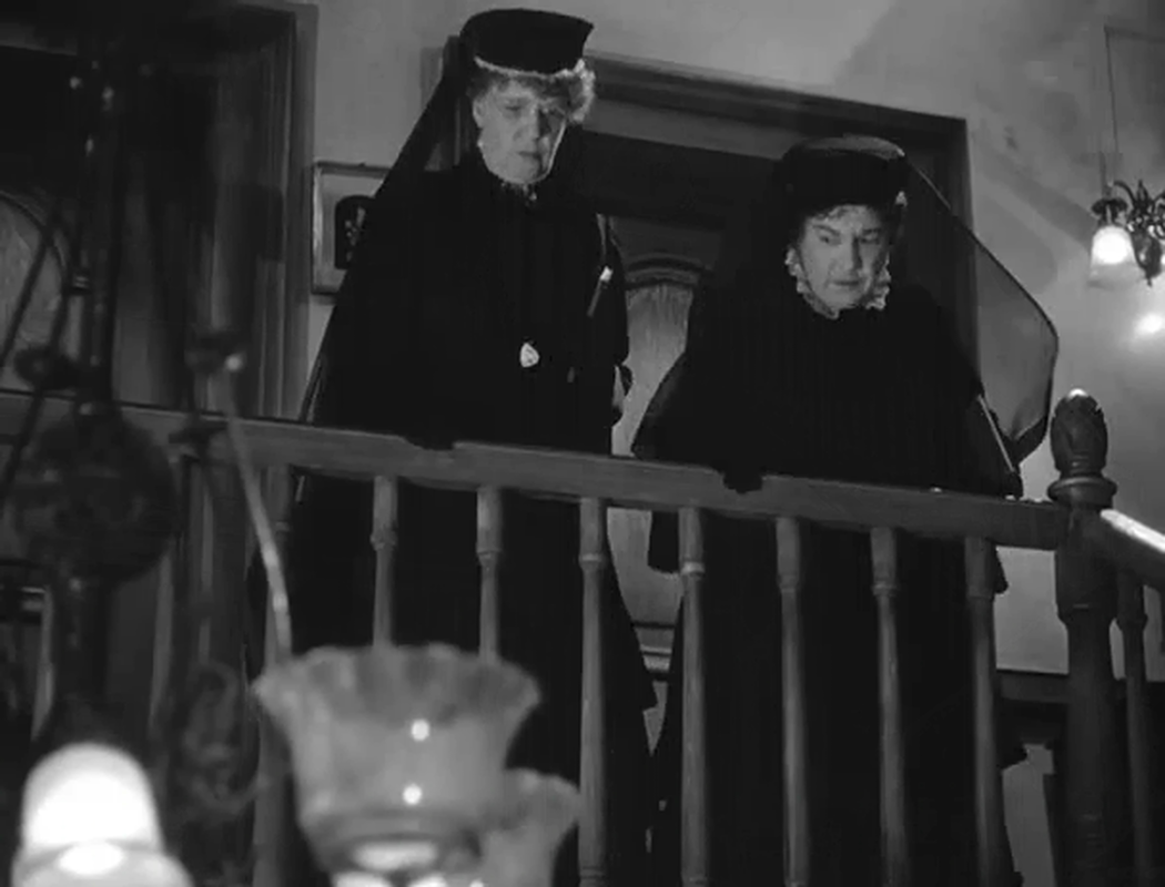 Description: As the aunts emerge upstairs, all dressed in black, we hear a sudden shift to heavy chords on a church organ (actually performed on the Novachord), conveying a funereal tone