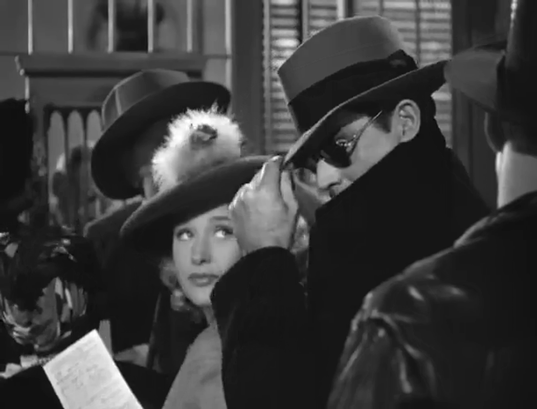 Comical underscoring is used (featuring woodwinds) as Mortimer Brewster attempts to hide his face from the reporters |
