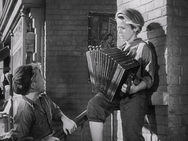 The street organ resumes playing after the street brawl with "The Bowery" (another tune about New York City); during this source music, a boy plays a few notes on the accordion |
