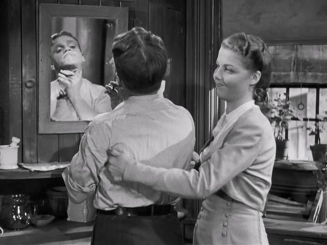 Peggy sees that Danny is jealous and they have a little argument, so Peggy pokes him while he is shaving, accompanied by a quick rising musical gesture; throughout this scene, the music matches Peggy's moods more than Danny's (he of kind of annoyed, but the music does not communicate that) |