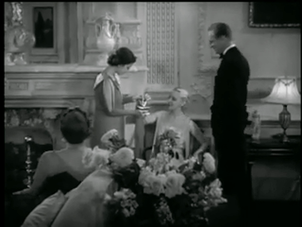 Description: In a replay of the previous scene, a woman opens a cigarette-case music box and it plays Mendelssohn's Wedding March; as the tune plays, the man looking for radio tubes in the drawer finds some new ones (in contrast to the previous scene where he couldn't find any radio tubes); this changes the course of the scene such that they can continue their "music and laughter" rather than discussing Martin's death from a year earlier