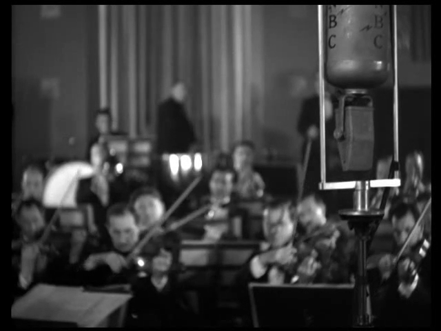 announcer | broadcast | dramatic | fanfare | on-screen music | opening title sequence | orchestra | playing | radio | source music | transcribed by ear
