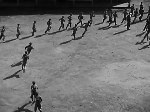 Upbeat and somewhat odd exercising music; music stops when they stop running; the film awkwardly cuts out measures 2-8 and 13-17 |