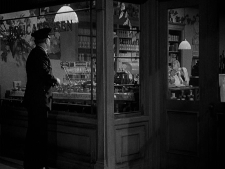 [m. 57] Clock 11:50; [m. 58] Cop at window; [m. 60] Woman holds up papers; [m. 61] Joe - Cop walking off |