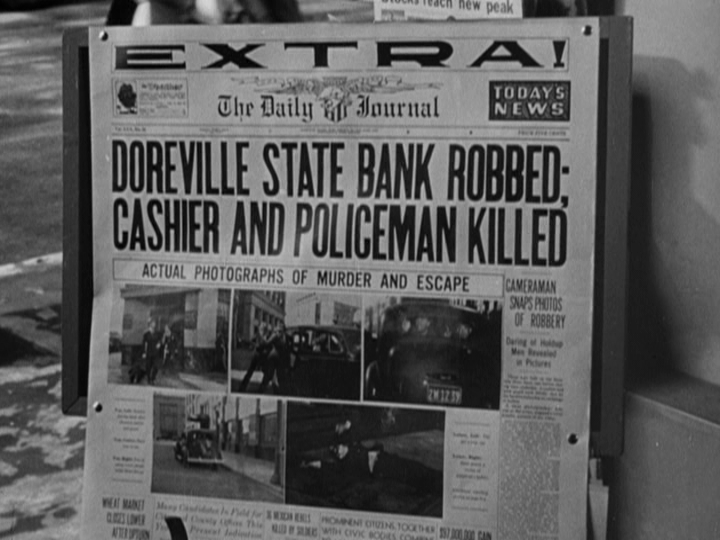 Transitional scene focusing on a newspaper headline about the robbery (with Joe's pictures); the music mimics the cry of the paper boy yelling "Extra! Extra!" with repeated two note-gestures and heavy brass accents |