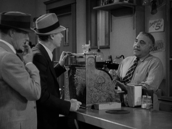 Description: The cashier (Nick) starts singing "My Wild Irish Rose," accompanied by an invisible orchestra (probably a radio playing), which continues playing the tune after he stops singing the first phrase; the score simulates music heard on the radio