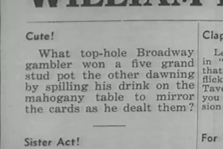 Muted trumpet and clarinet play a sultry, bluesy lick as we read a newspaper clipping that reads: "Cute! What top-hole Broadway gambler won a five-grand stud pot the other dawning by spilling his drink on the mahogany table to mirror the cards as he dealt them?" |