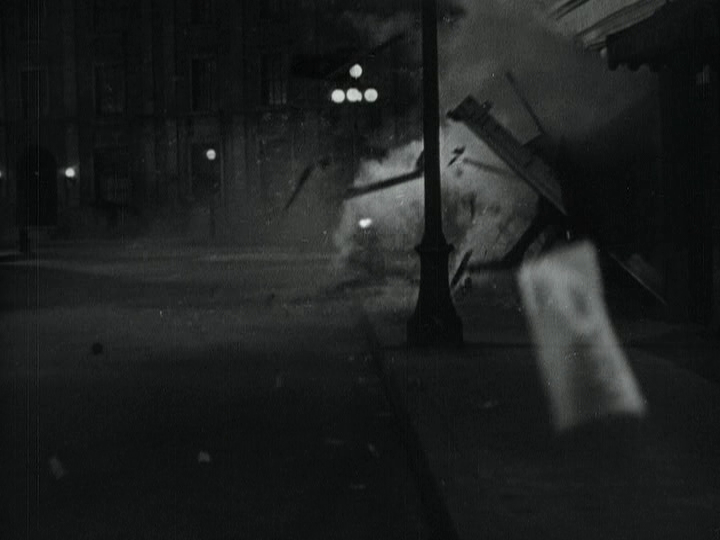 Film annotations: [m. 17] Throw bomb; [m. 18] Explosion / Newspapers circle / Debris falls