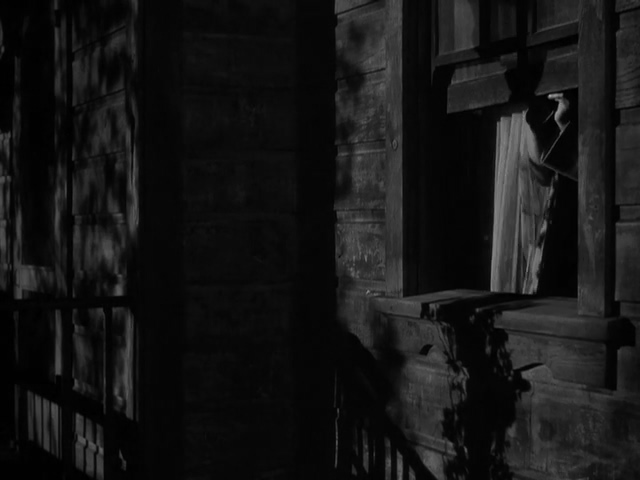 Frantic underscoring as Verna jumps out the window and runs to the barn, with occasional pauses for the actions on screen; wind sound effects outside; the music cuts out suddenly when Cody puts his hand on her mouth |
