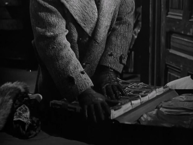 conversing | dark | gangster | leading lady | leading man | love scene | moll | money | murderer | packing | room | tense | transition