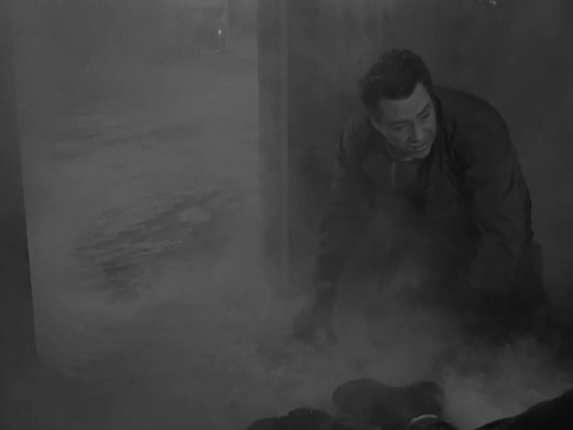 action scene | agent | crawling | dramatic | factory | fugitive | gangster | gun | leading man | mickey-mousing | murderer | rushing | tear gas | tense