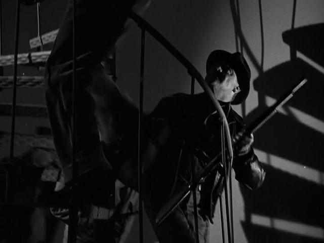 action scene | agent | ascending | dramatic | factory | fleeing | fugitive | gangster | leading man | mickey-mousing | murderer | police | running | rushing | stairs