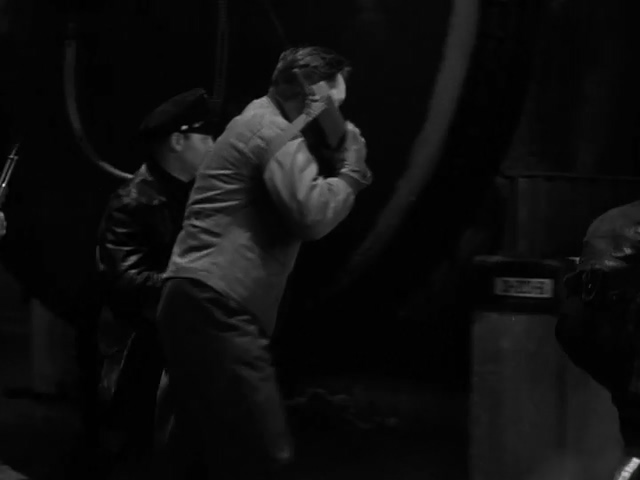 action scene | agent | chasing | combination of themes | dramatic | factory | fugitive | gangster | leading man | murderer | police | raid | running | rushing | tense