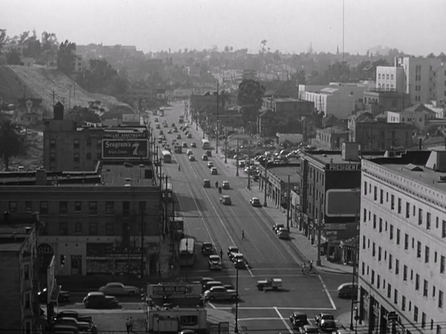 Brass-heavy, mysterious, dark music as we pan across the cityscape; idea repeats twice, beginning strong low brass downbeats, followed by horn chords |
