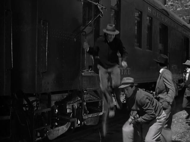 On-screen: Gangsters leap from the train