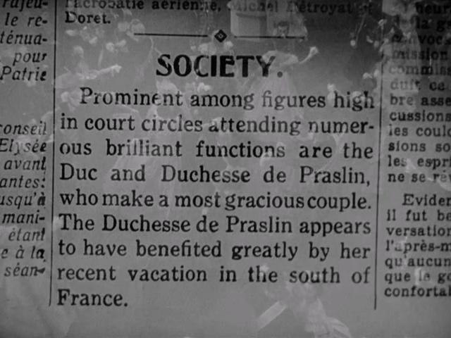 We see a montage of newspaper clippings about the Duke and Duchess and people dancing at a ball; the music portrays the waltz on-screen |