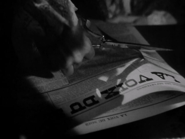 Film annotations: [m. 82] Hands cutting newspaper; [m. 94] Mlle Mayard smiling