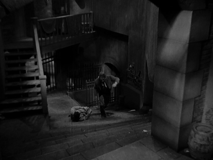 Dramatic underscoring beginning with a stinger; accents mark the following events: the door closing, Dan calling to the rebels, and Gypo hitting a guard; running gestures are heard as the rebels chase after Gypo |