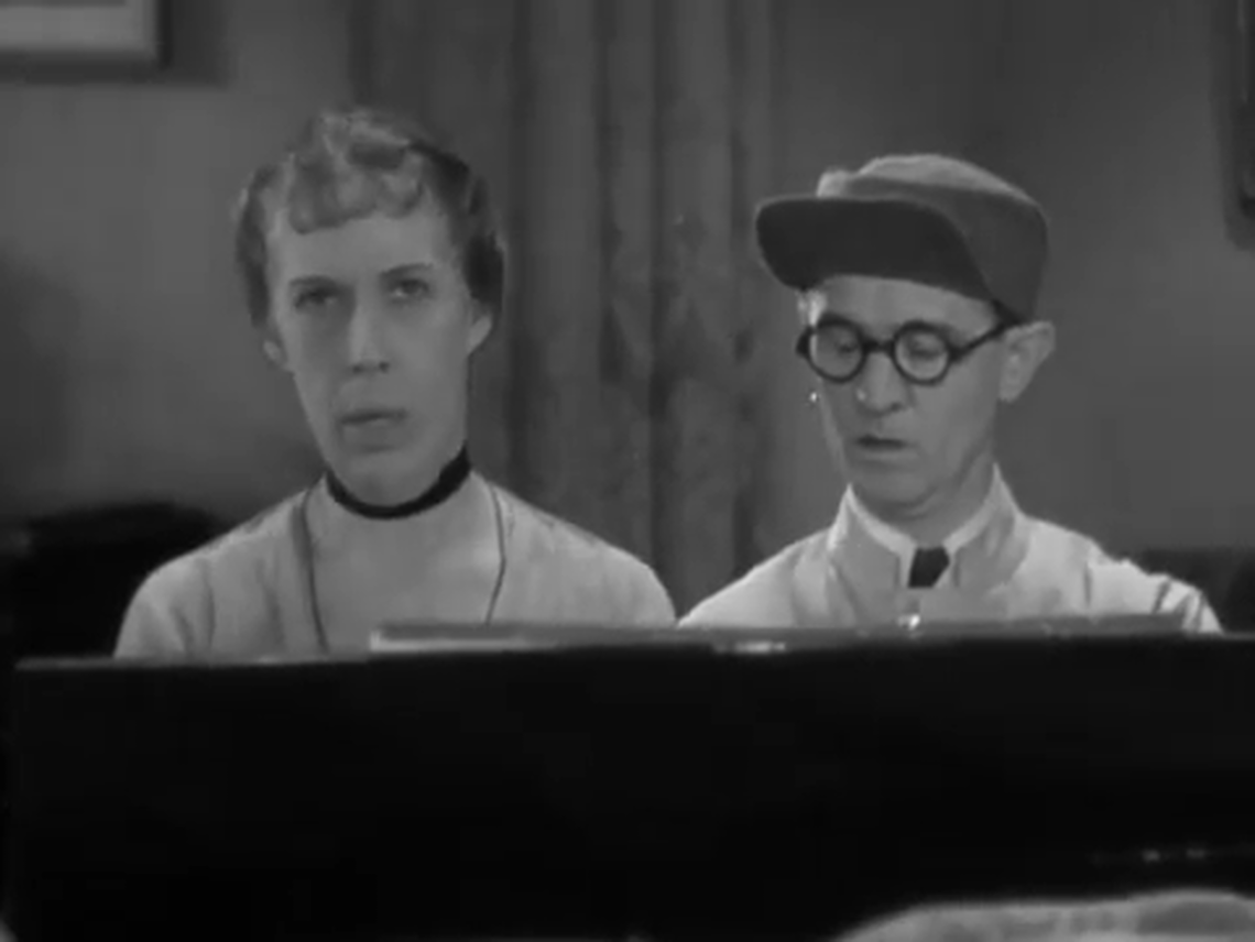 advance plot | comic | comical | conversing | office | on-screen music | playing | prisoner | singing | source music