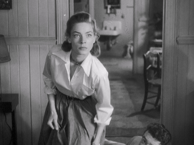 Rapid crescendo to another violent climax with frantic string gestures as Nora rises to attack Rocco; dissonant string cluster is sustained as Rocco forcibly kisses Nora (sounds like a cue from a horror film, and she looks horrified) |