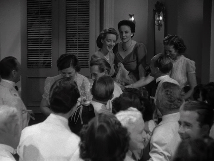 The dinner music continues and moves to the foreground as Leslie enters the main ballroom; we see people dancing and a few musicians in the background (one pianist, a bass player, a trumpeter, a guitarist, and a saxophonist); they are obviously faking it since the instrumentation does not match the music that we hear (a dance band with a full reed section and brass section) |