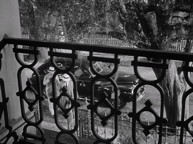 Tense underscoring as policemen exit the car and enter the house; Stanley watches from the window |