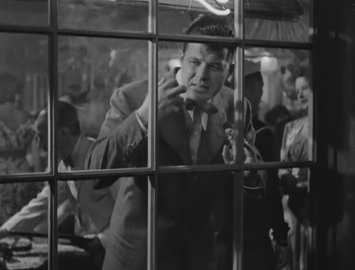 Description: Source music coming from a nearby restaurant ("You Must Have Been a Beautiful Baby") gets louder and softer as the camera moves in and out of the restaurant; the source of the music becomes clear as the camera pans to a lady singing and a piano on the stage; the music is turned down under dialogue