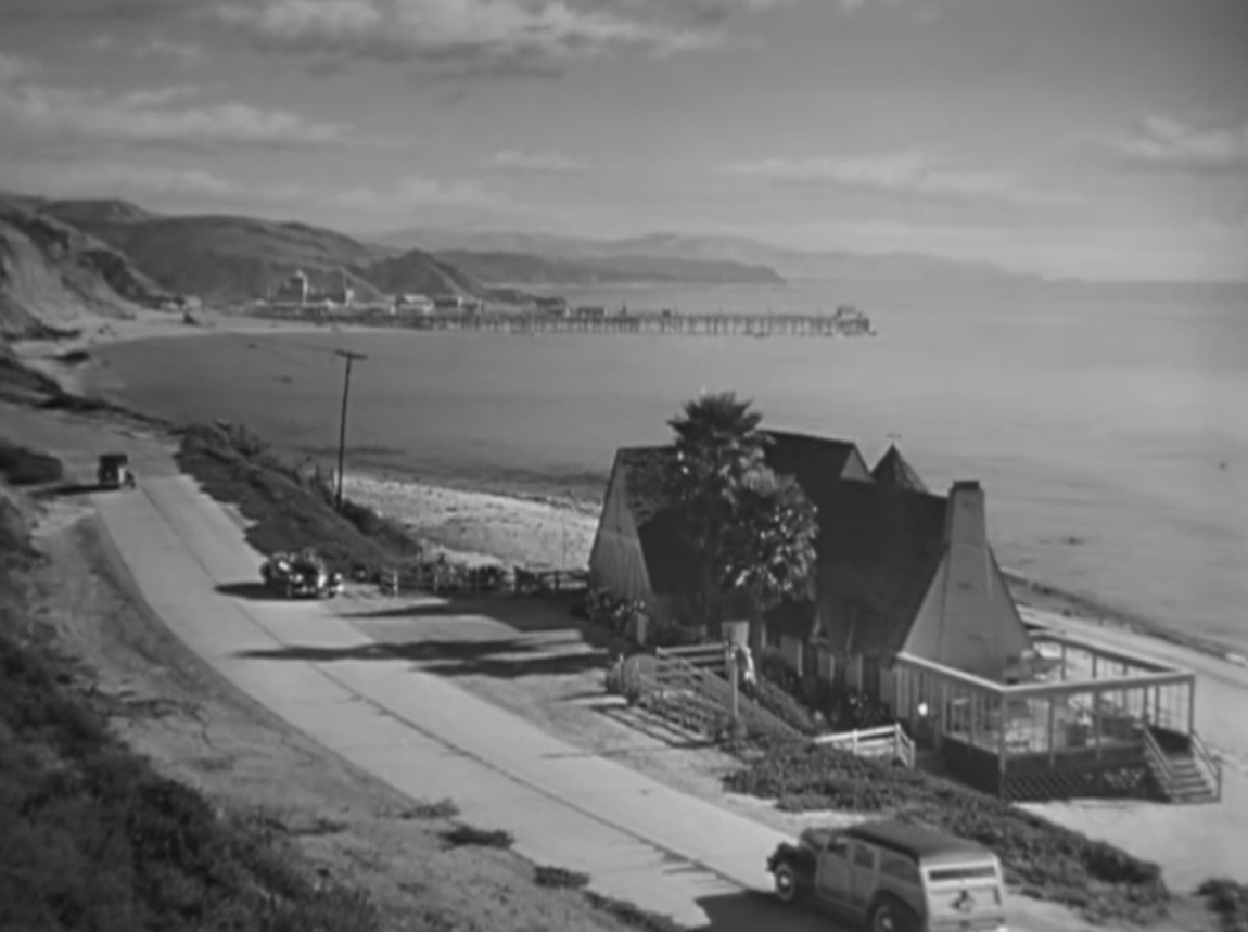 We hear a broad, lyrical theme in upper-register strings as Mildred and Wally approach the beach house; Steiner uses harp arpeggiations to represent the waves in the background |