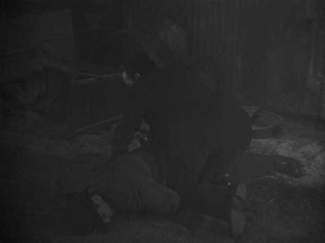 Tense underscoring as Marlowe gets the keys to the handcuffs and frees himself |