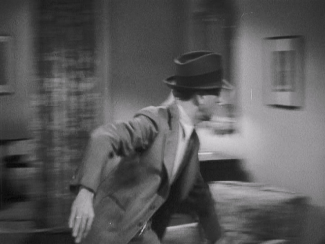 A chase scene begins with a stinger following the unexpected gun shots, followed by rushing music as Marlowe runs out the door after the killer |