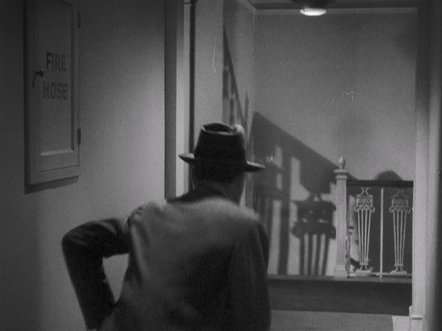 As Marlowe and the killer run down the stairs, we hear descending sequential patterns in the upper register ("Down the Stairs"); below this is a rhythmic accompaniment ("The Chase") that is identical to the Sailors theme in King Kong (1933), generating excitement during the chase; layered on top of this are several statements of Marlowe's theme in a heroic variant, played dramatically by brass |