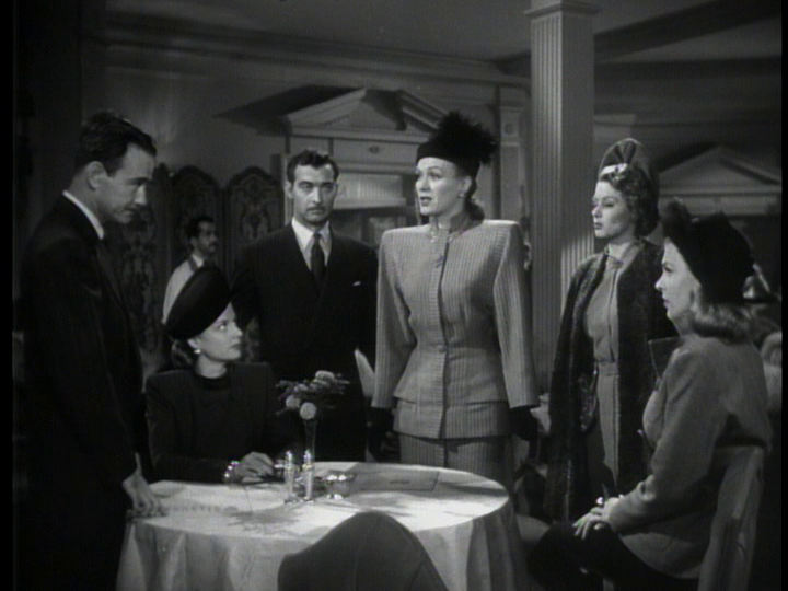 AABA structure | advance plot | calm | conversing | husband | lawyer | leading lady | on-screen music | restaurant | sister | source music | transition | victim