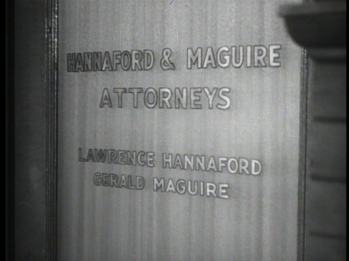 A heroic and solidly tonal string melody as we see the sign on the attorney's door: "Hannaford & Maguire Attorneys"; the lawyer is the only character given a heroic-sounding theme in the film |