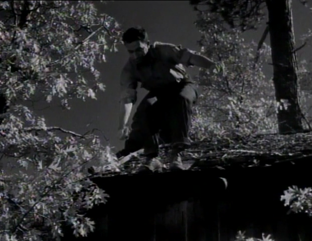 action scene | cabin | convict | dramatic | fugitive | jumping | leading man | love interest | manhunt | mickey-mousing | police | tense