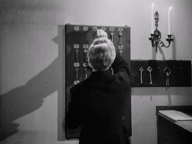 As the porter takes the keys he needs off of the wall, he recites a little nursery rhyme to himself: "One, two, buckle my shoe," which Steiner accompanies with comical music, making it seem as if he is singing along with score |
