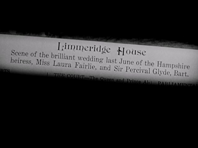 A newspaper headline announces: "Limmeridge House: Scene of the brilliant wedding last June of the Hampshire heiress, Miss Laura Fairlie, and Sir Percival Glyde, Bart." and we see a large picture of Limmeridge House; the music used is the Pavan from the main title; Steiner adds chimes to the cue because of the wedding announcement |