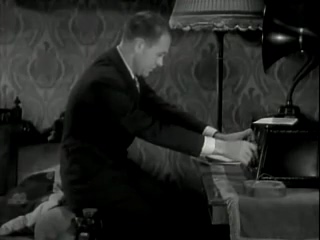 Phil turns on the radio (using the dials) and we hear pleasant background music for the next scene (a love scene); the song is "My One Ambition is You" (from the movie Dixiana, which was one of the first films orchestrated by Steiner at RKO); first we hear the verse, then the chorus (played twice), then a piano interlude that leads to a more upbeat statement of the chorus featuring muted trumpets; near the end, the lead female character responds to the music, smiling and moving in time; soon after, two other characters begin dancing to the music in the other room |